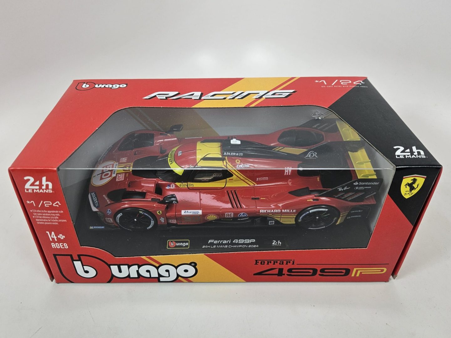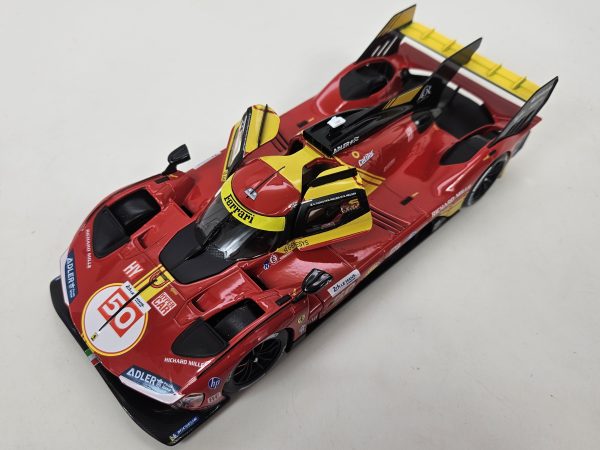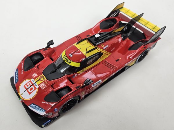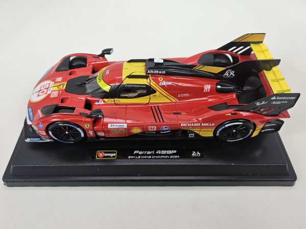 Produced by Bburago, this is a detailed 1:24 scale Diecast replica of the #50 Ferrari 499p Hypercar, that won the 2024 24 Hours of LeMans. Features authentic sponsor and team logos, detailed cockpit, opening doors, and rubber tires. Limited edition.