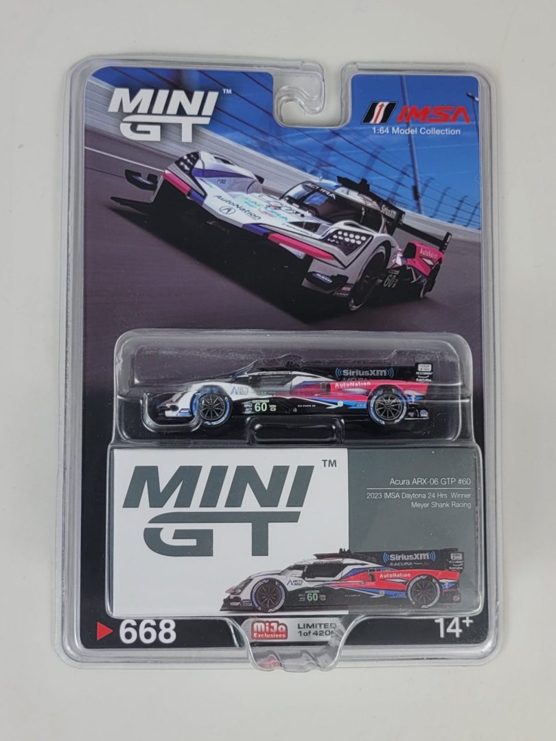Produced by Mini GT. This 1:64 diecast is a replica of the Acura ARX-06 GTP that was victorious at the 2023 edition of the Rolex 24 at Daytona ran by the Meyer Shank Racing team driven by Tom Blomqvist, Simon Pagenaud, Colin Braun, and Helio Castroneves.