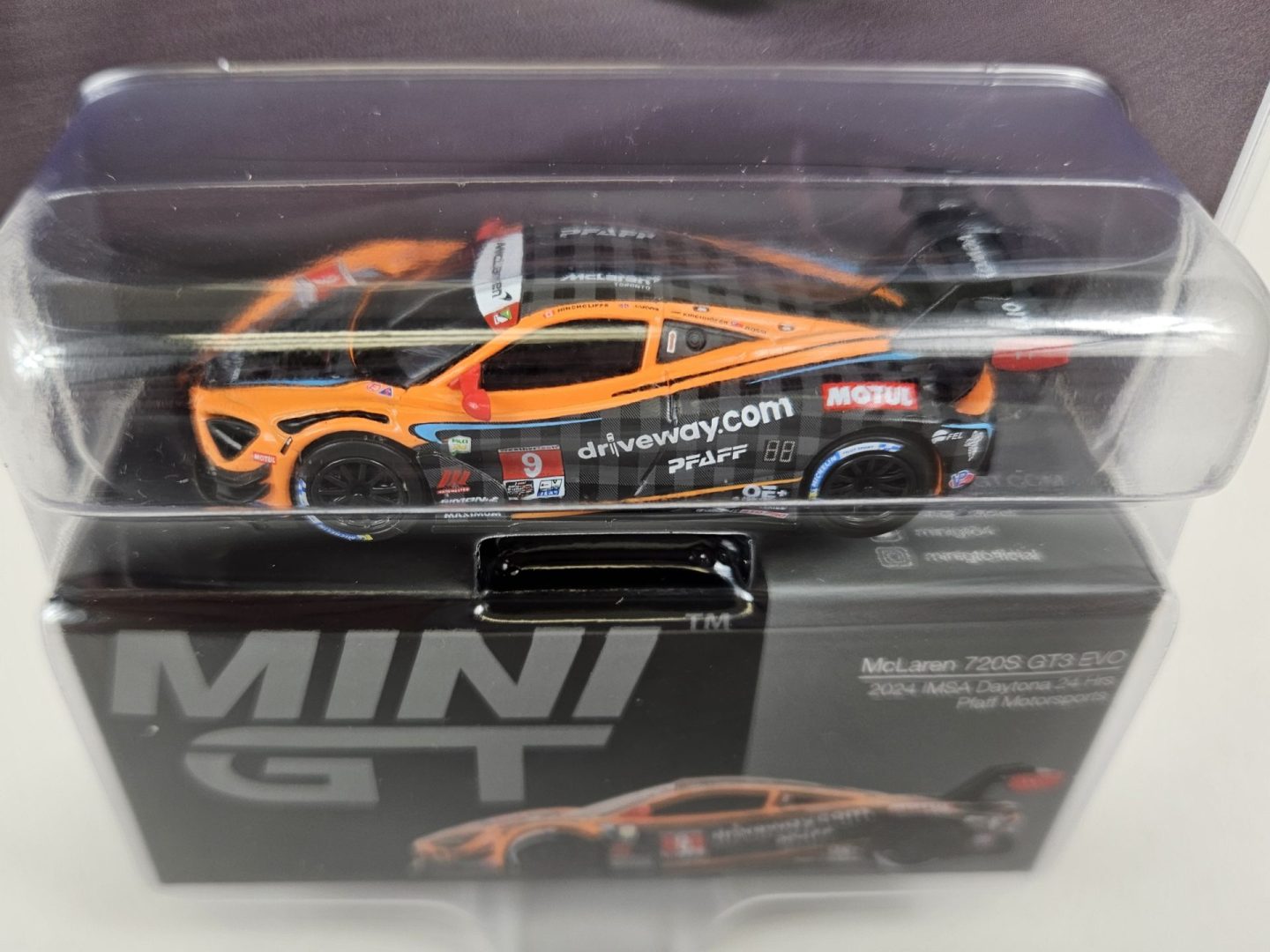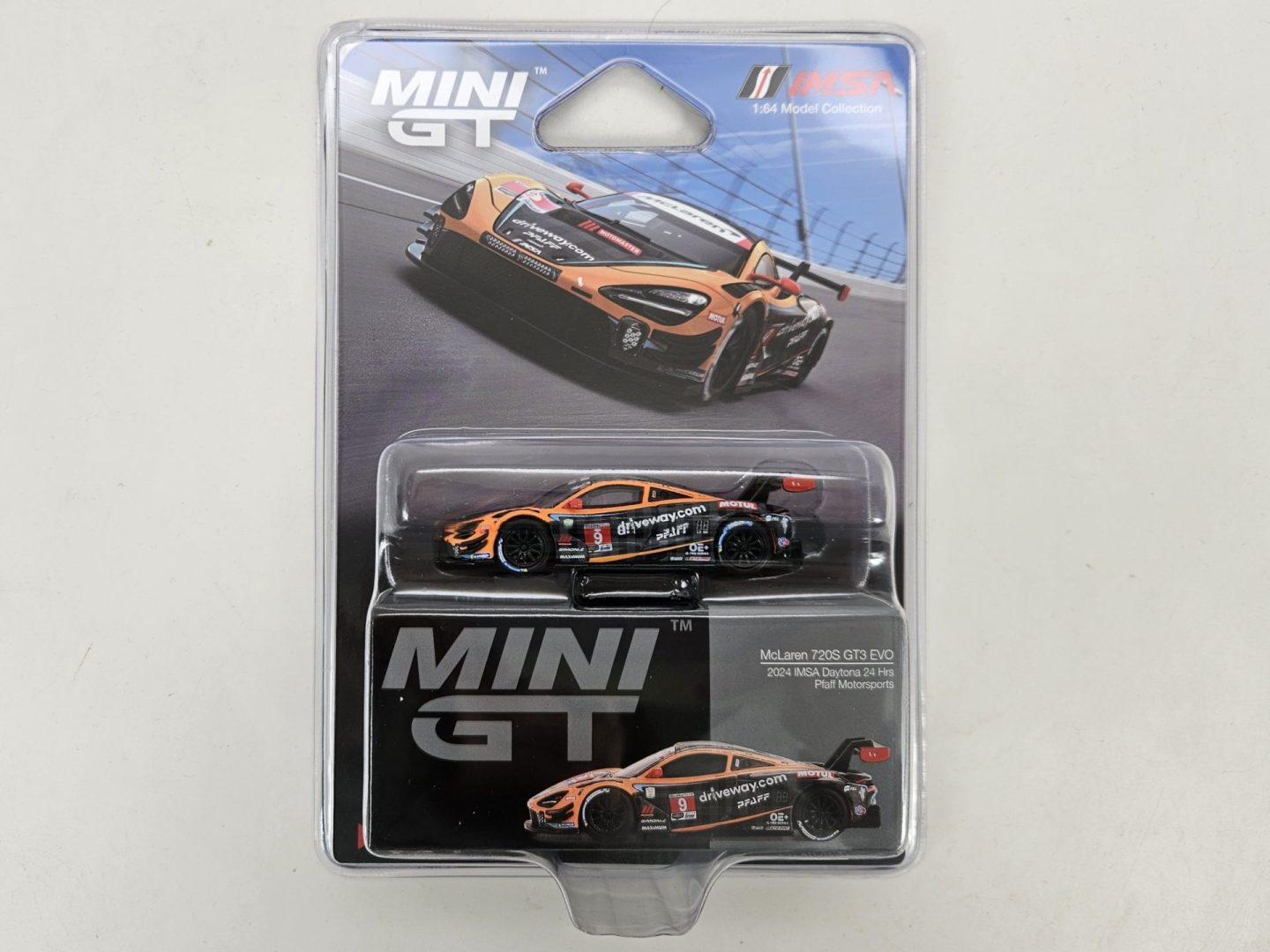 Produced by Mini GT, this is a detailed 1/64 scale 2024 #9 Pfaff Mclaren 720S GT3 Evo, that competed at the 2024 24 Hours of Daytona. Features authentic logos, detailed cockpit, rubber tires and comes with a attractive clam shell packaging. Limited edition.