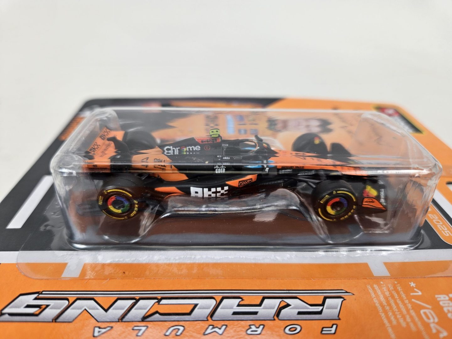 Produced by Bburago, this is a diecast of the 2025 #4 Mclaren MCL39 driven by Lando Norris at the Australian GP. Diecast features real rubber tires, a detailed cockpit.