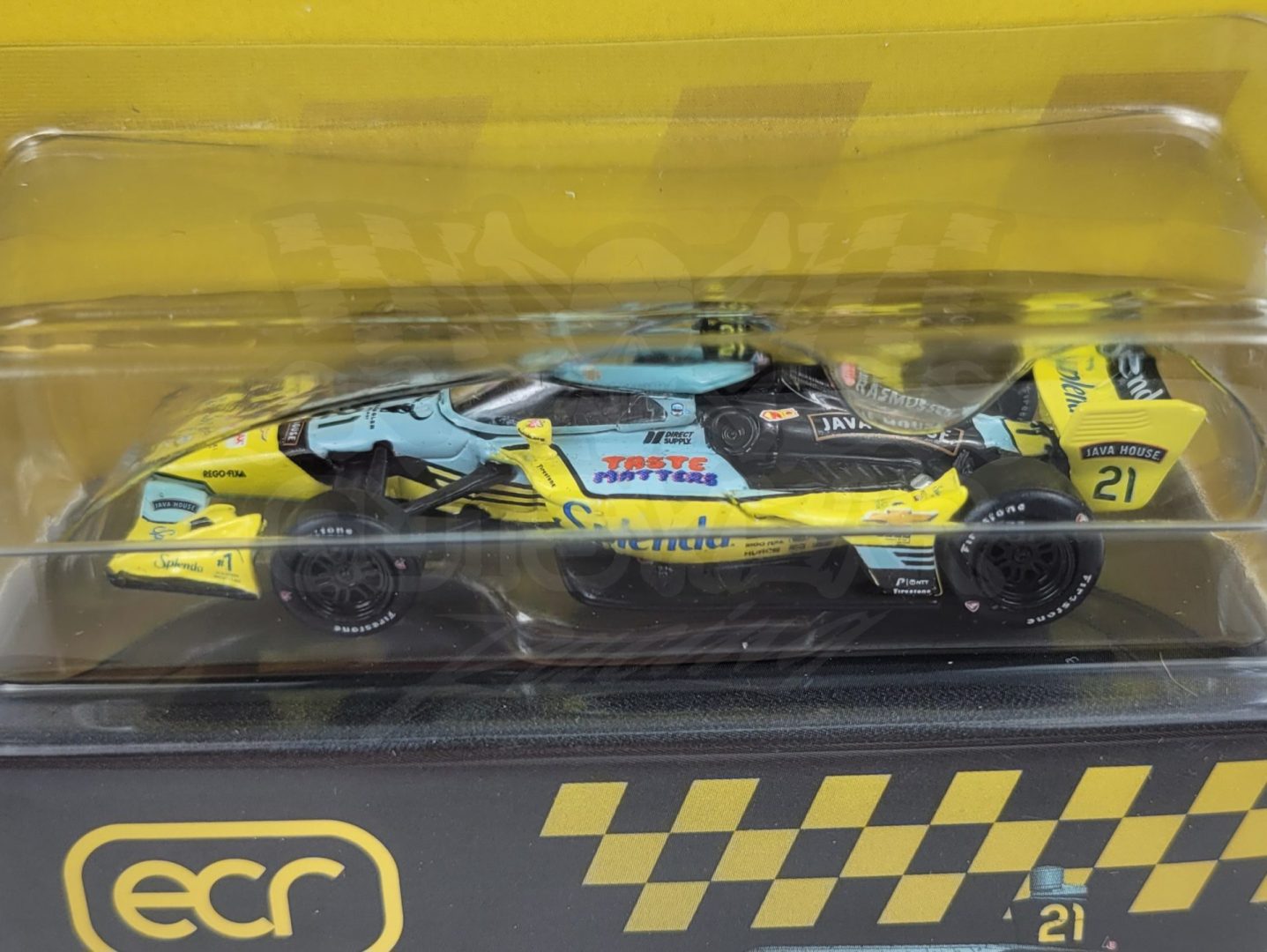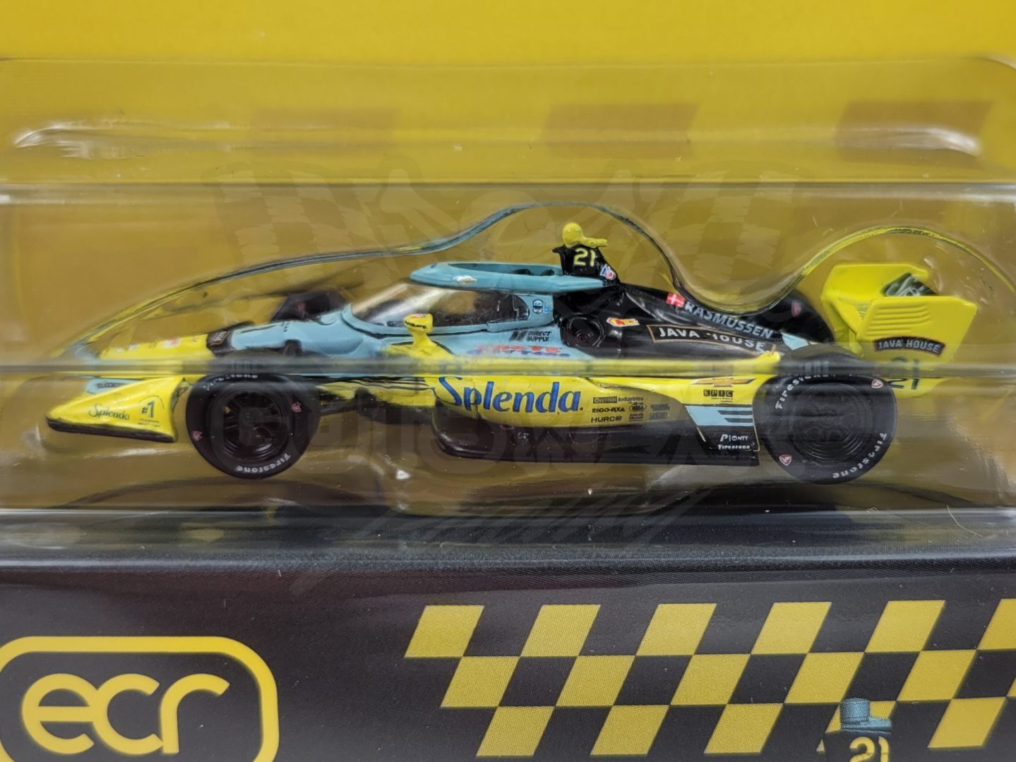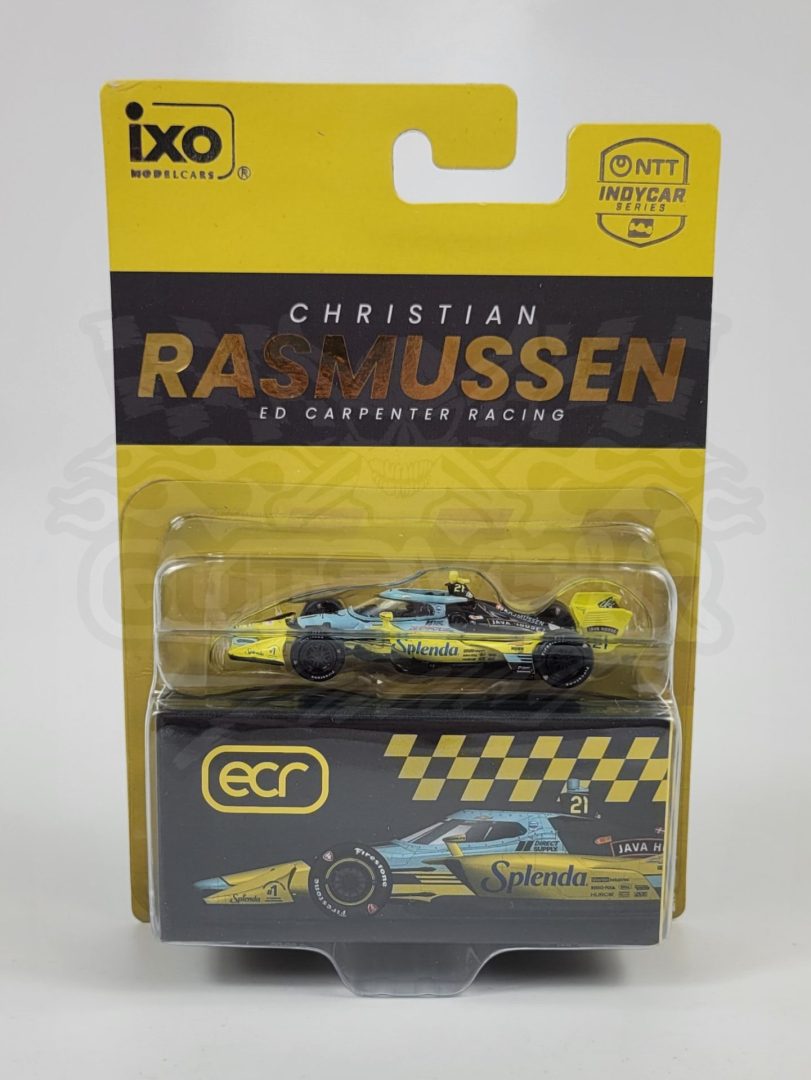 Produced by IXO Model Cars, this is a detailed 1/64 scale 2026 #21 Splenda Ed Carpenter Racing, Chevrolet-powered Dallara IndyCar driven by Christian Rasmussen. Features authentic logos, a detailed cockpit, rubber tires, and comes with a collector box. Limited edition. Officially Licensed by IndyCar.
