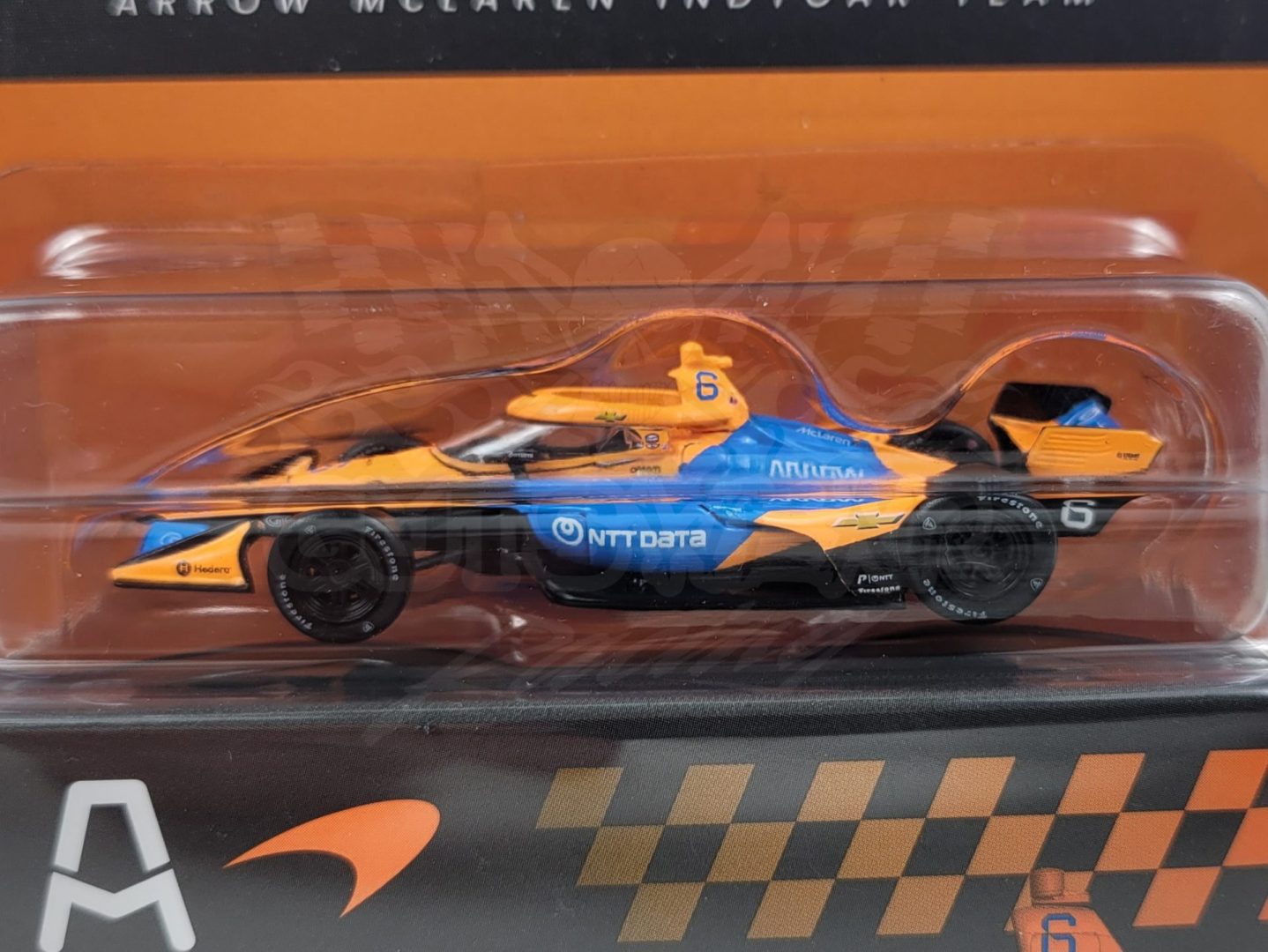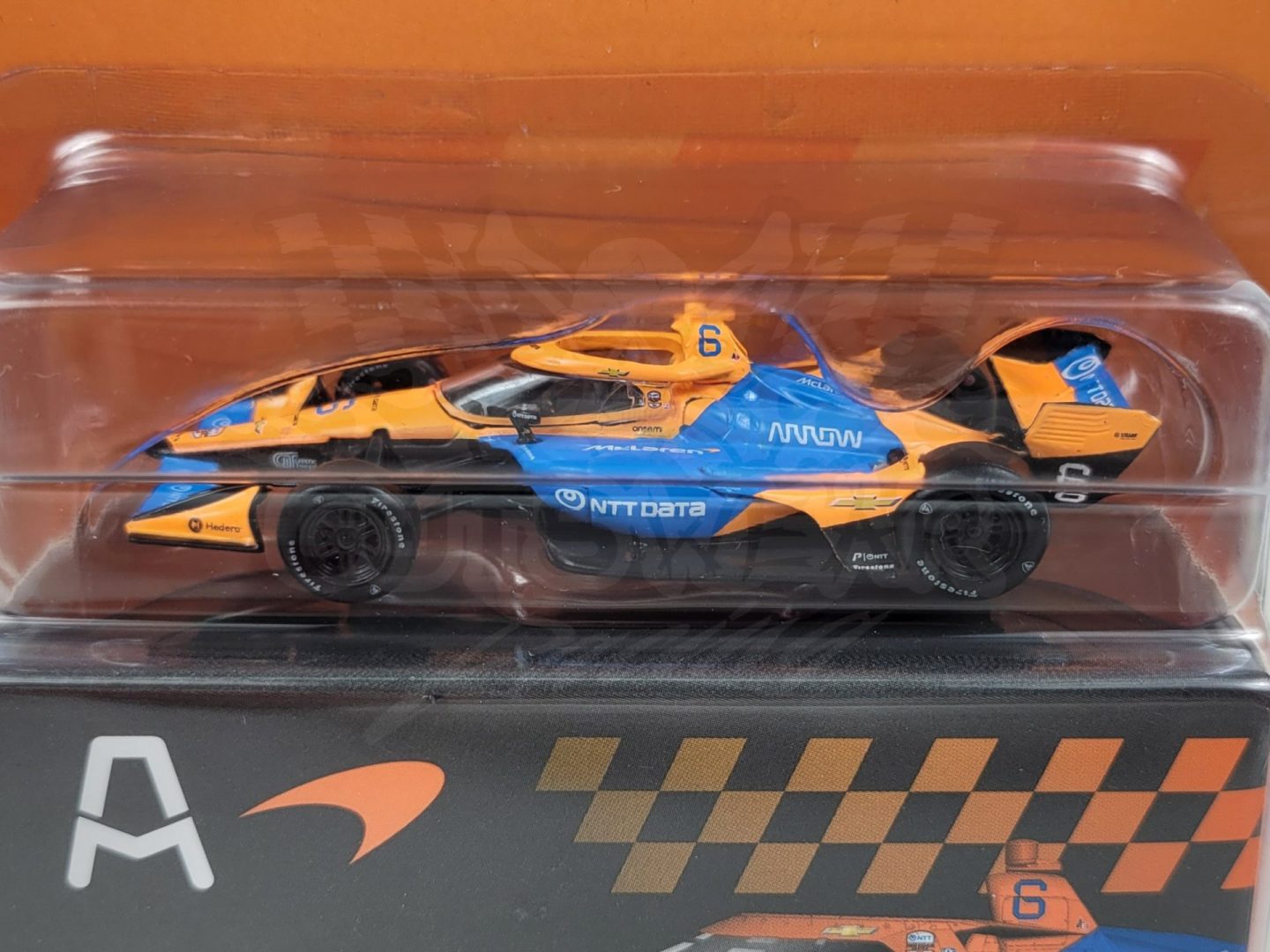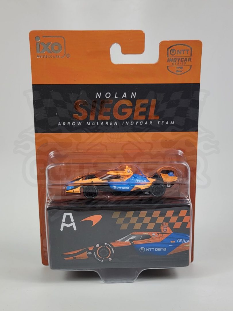 Produced by IXO Model Cars, this is a detailed 1/64 scale 2026 #6 NTTData Team McLaren, Chevrolet-powered Dallara IndyCar driven by Nolan Siegel. Features authentic logos, a detailed cockpit, rubber tires, and comes with a collector box. Limited edition. Officially Licensed by IndyCar.