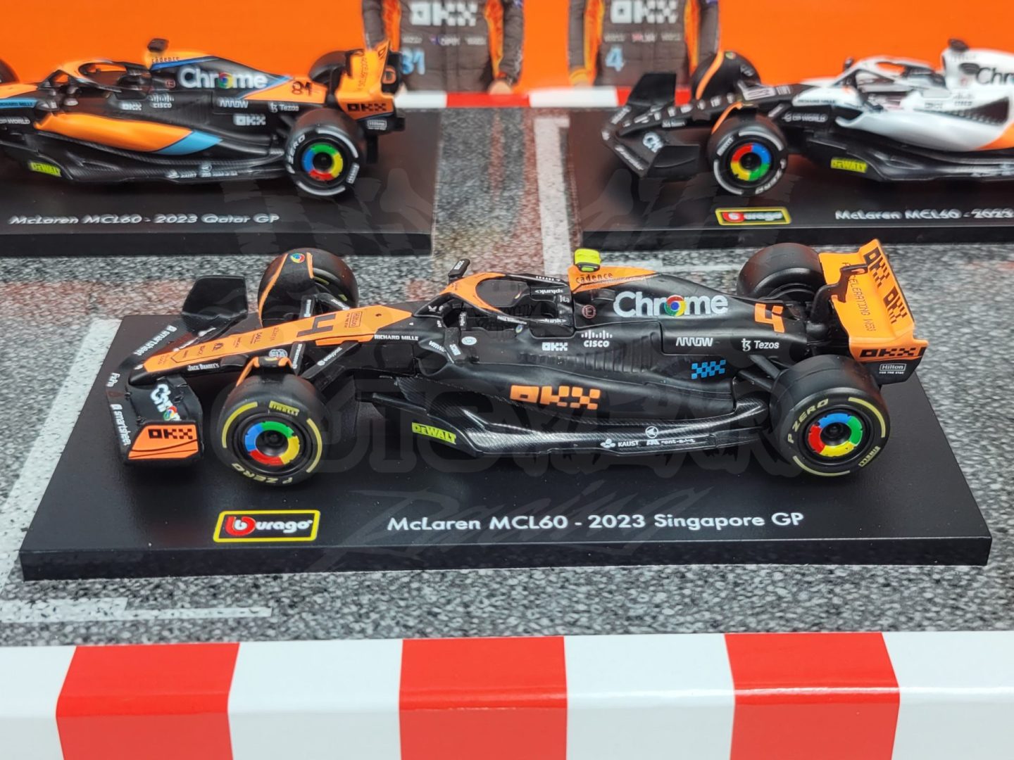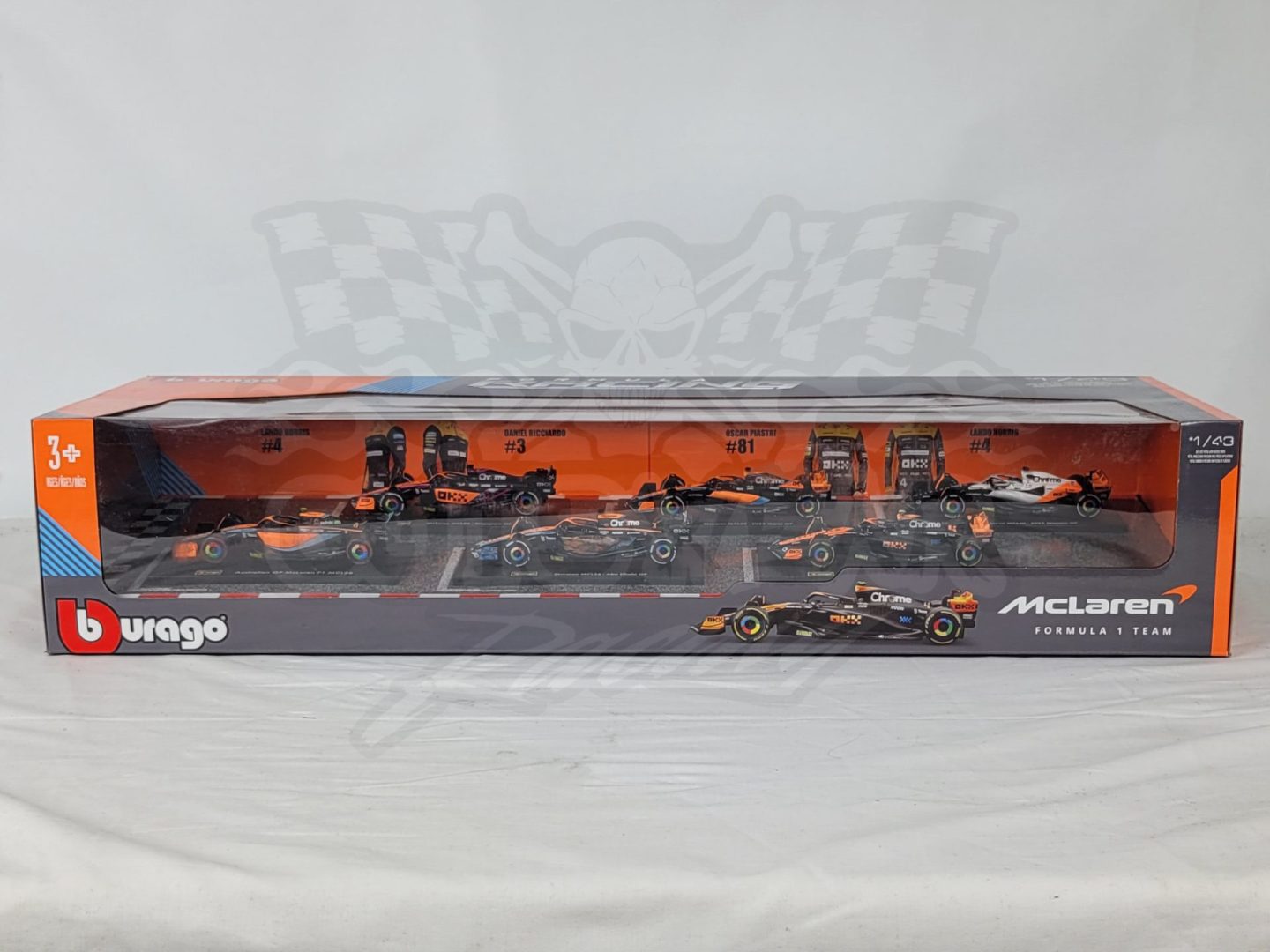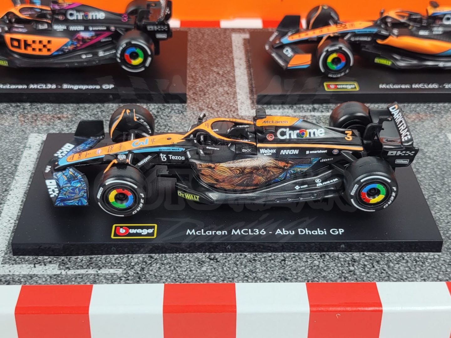 Made by Bburago. This McLaren Formula 1 set includes 6 cars from throughout the last few of seasons including multiple special one off liveries from drivers like Daniel Riccardo, Oscar Piastri, and Lando Norris.