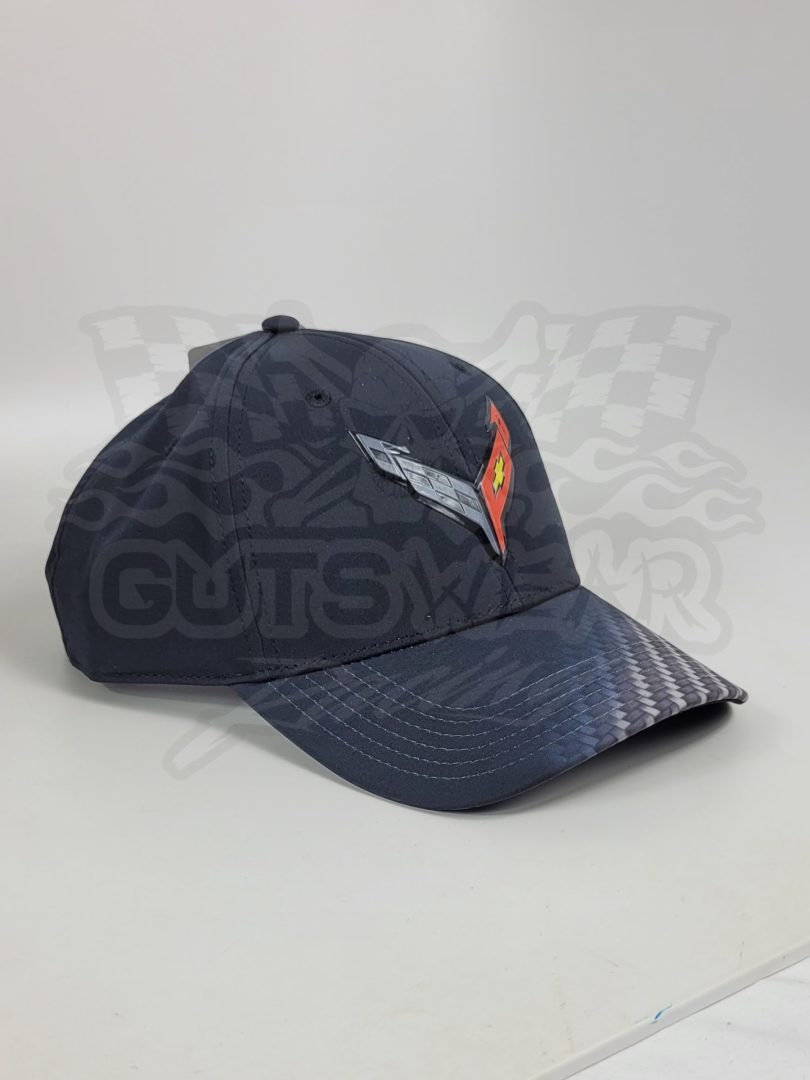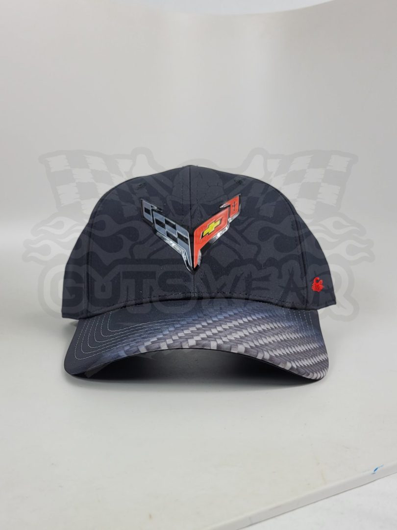 Made by Cruisin Sports. This hat features a metallic Corvette emblem attached to the front of the hat completed with a carbon fiber pattern across the bill.