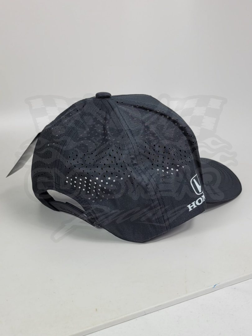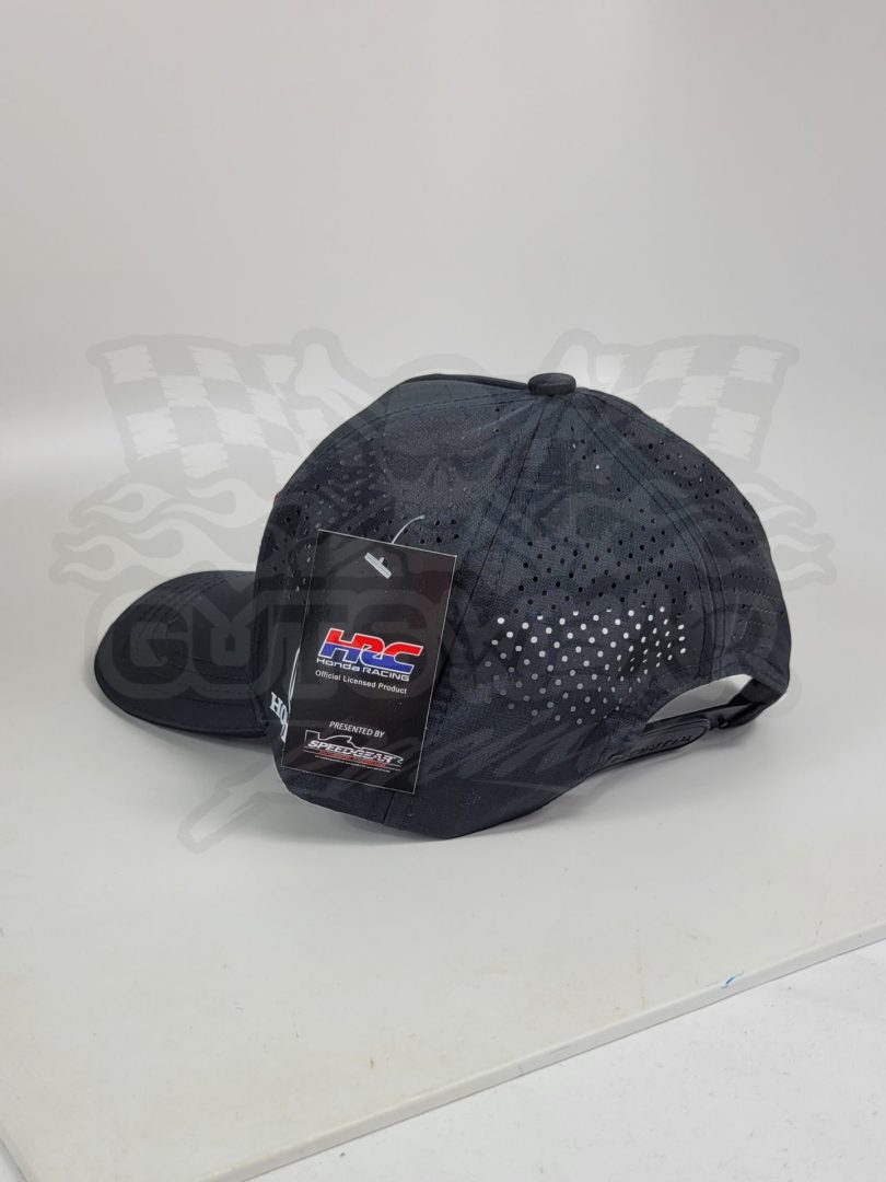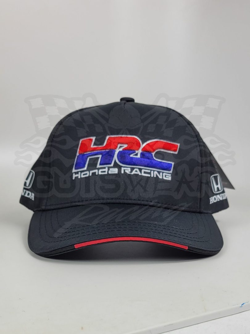 Made by SpeedGear. This black hat features the new Honda Racing HRC branding on the front of the hat with Honda logos shown on both sides as well and has a breathable mesh like material around the back half. This hat is an officially licensed Honda product.