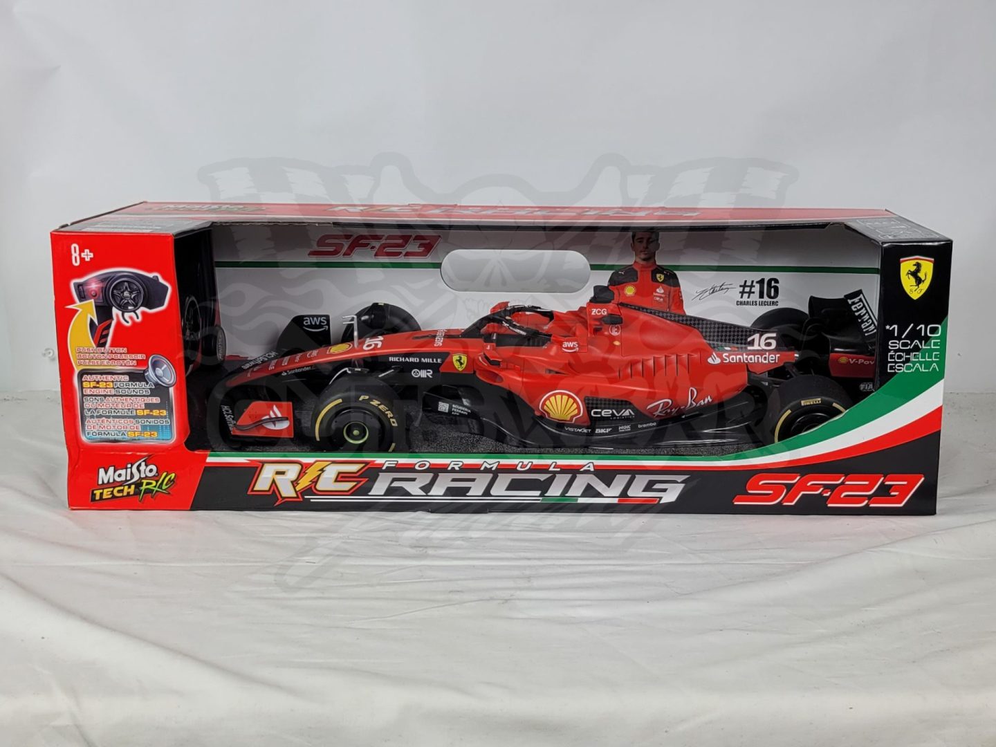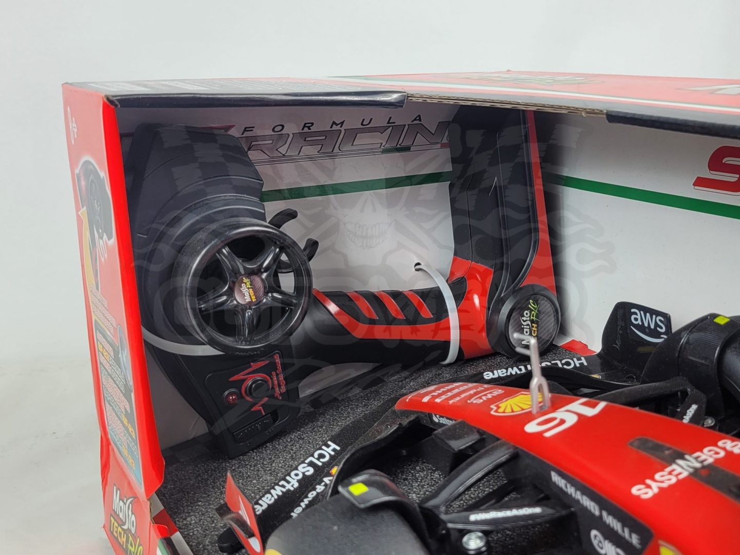 Made by Maisto. This remote control car is modeled after the SC-23 created by Scuderia Ferrari and driven by Charles Leclerc. This kit includes a pistol grip controller with a button that turns on realistic F1 sounds.