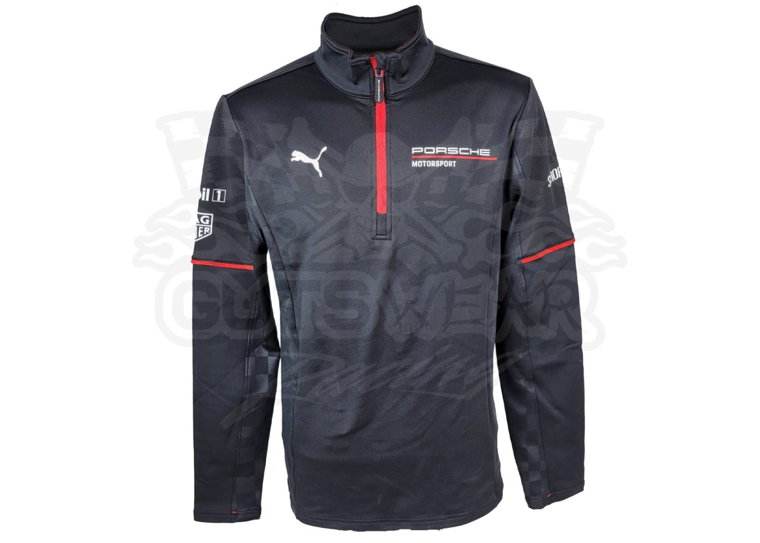 Made by PUMA. This quarter zip is a replica apparel of what the team wears to the track. Complete with the Porsche Motorsports logo on the chest and team sponsors spread across the sleeves and back. This product is officially licensed by Porsche and is made with 92% polyester and 8% elastane.